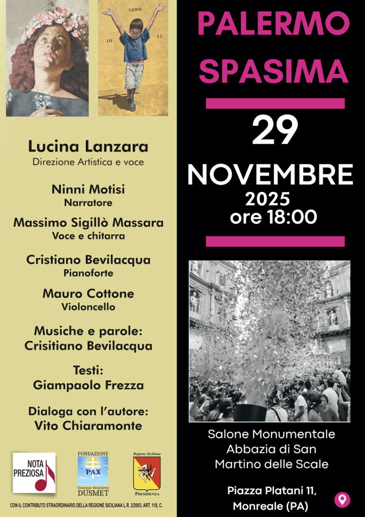 Sabato 29 novembre, alle 18:00, il salone monumentale dell’Abbazia di San Martino delle Scale (Piazza Platani 11, Monreale – Palermo) accoglierà Palermo Spasima, un evento unico nel suo genere promosso dalla Fondazione G.B. Dusmet e Nota Preziosa: un percorso poetico e musicale che trae origine dal libro di Giampaolo Frezza, Palermo Spasima, e che diventa occasione di meditazione culturale e affettiva sulla città.